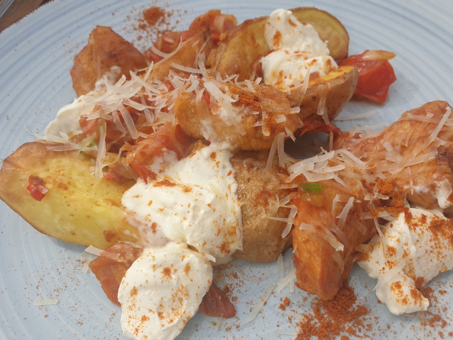Paprikahähnchen mit Ofenkartoffeln, Krischtomaten und Creme Fraîche