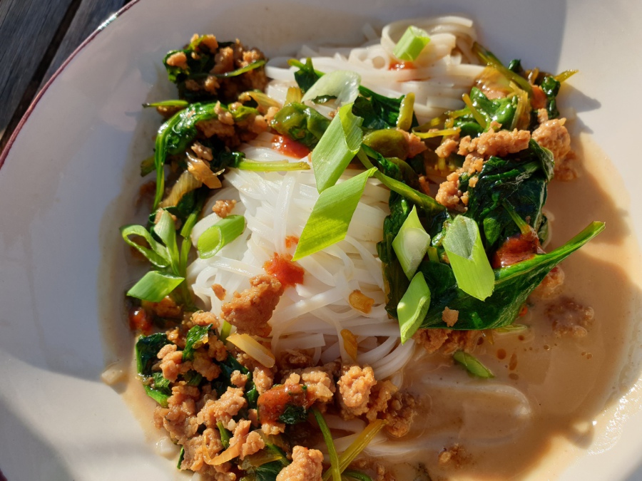 Den Spinat jetzt noch zum Hackfleisch dazu geben und unterrühren. Mit der restlichen Sojasauce und Salz und Pfeffer abschmecken.