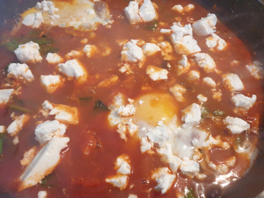 Zum Schluss nur noch den Feta über alles krümeln und mit dem restlichen Spinat garnieren.